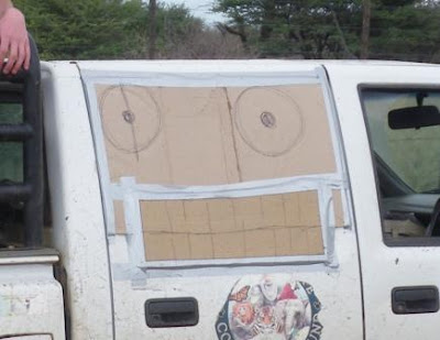So when my fellow keeper Kate decided to introduce our feeding car to a rather large kudu the end result was a broken window. Myself and fellow brit Hamish (a.k.a punk kid) went about making a temporary cover for the window and as we were doing so we noticed something very familiar - why we had created the Mighty Boosh logo! Both being fans of the great UK comedy show we added a few finnishing touches and showed of our creation to the cheetahs who were suitably impressed! Ok maybe they weren't but it made me and Hamish happy!